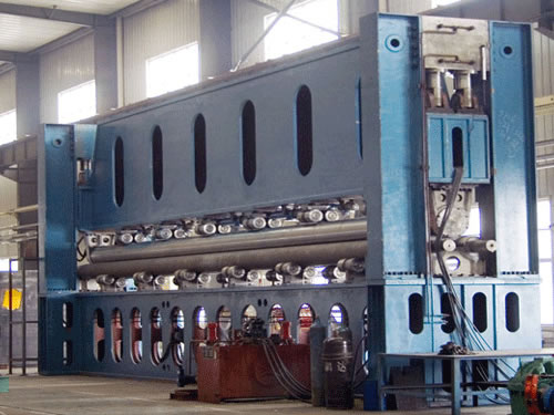 Marine plate rolling machine is applicable to super wide arc-shaped parts. This marine plate bending machine adopts three-roller symmetrical structure. The top roll moves vertically on the symmetrical central position of the two lower rolls. The rolling equipment's two bottom rolls do rotational movement providing torque to the rolling sheet. There are sets of carrier rollers at the bottom of the two lower rolls in order to improve the rigidity of the lower rolls. There is a rigid beam at the top of the marine plate bending machine's upper roll. Multiple sets of carrier rollers are between the beam and the upper roll, which can improve the rigidity of this rolling equipment's upper roll.