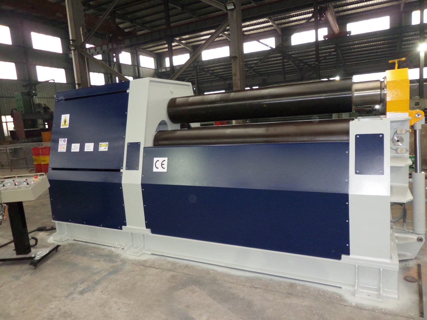 Curve down 3 roller plate rolling machine is also known as arc down-adjusting 3-roller rolling equipment. It has three rolls for the whole drive roller. The planetary gear hydraulic motor provides torque to roller plate. There is no mutual sliding between the work piece and the basic roll. The roller is driven by hydraulic cylinder to do arc up and down movement. This plate rolling machine possesses self-aligning roller bearings. This arc down-adjusting 3-roller rolling equipment has the advantage of feeding without the aid of accessory devices. It is able to complete the pre-deformation of both ends and carry out sheet metal shaping. The main structure of this plate rolling machine includes tip side of the rack, fixed side of the rack, work roll, drive, hydraulic system, electrical control system and other components.